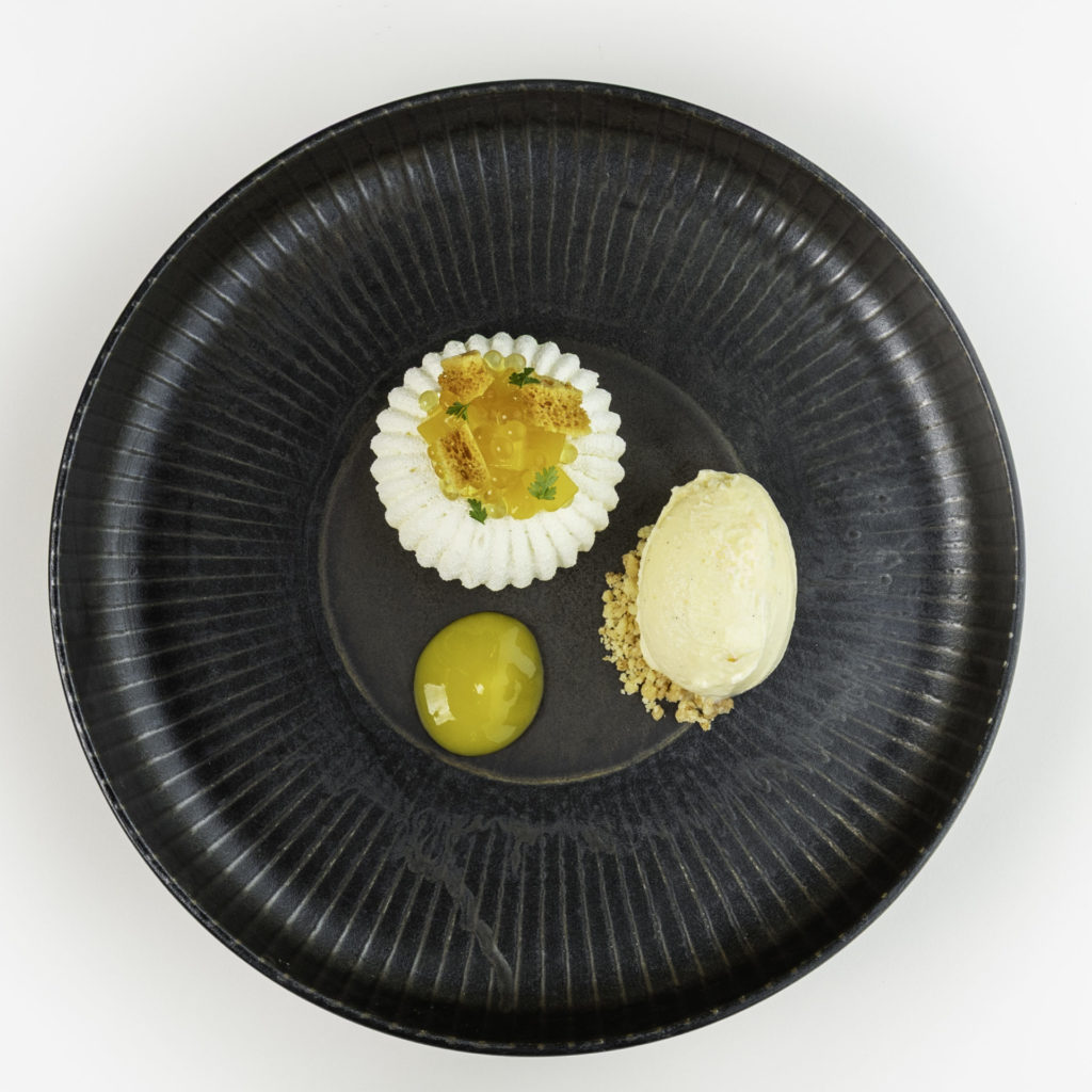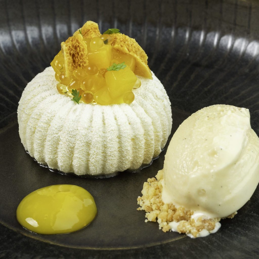 Biancomanger aux amandes, mangue marinée, glace vanille